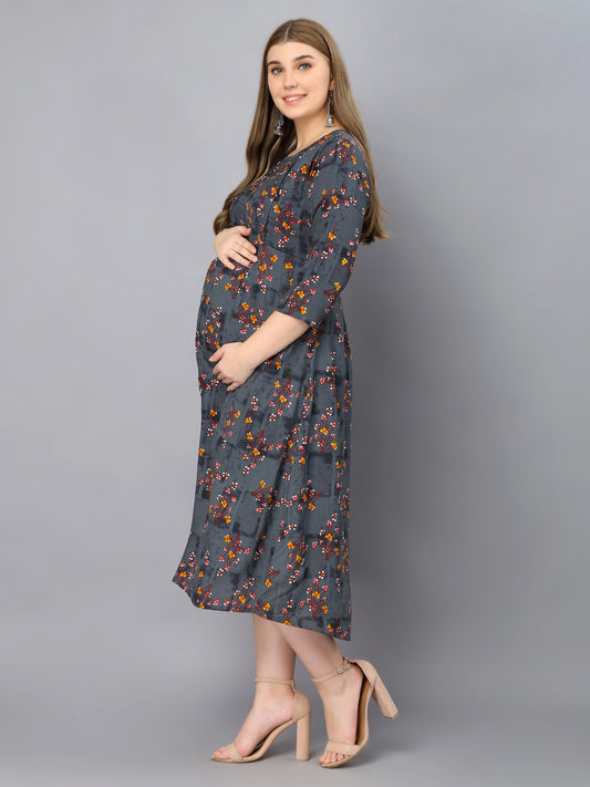 Dark Grey Flower Printed Maternity Feeding Gown with Zip