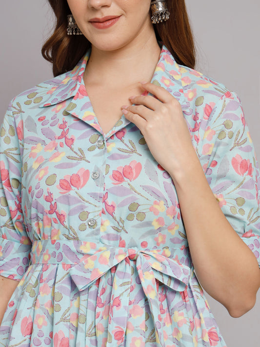Light Blue Flower Printed Cotton Co-Ord Set