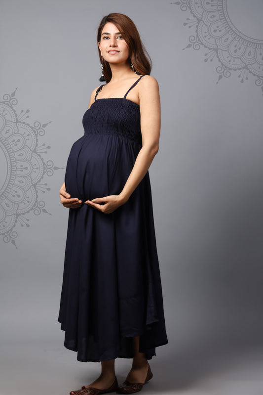 Solid Navy Blue Color Shoulder Straps Maternity Gown