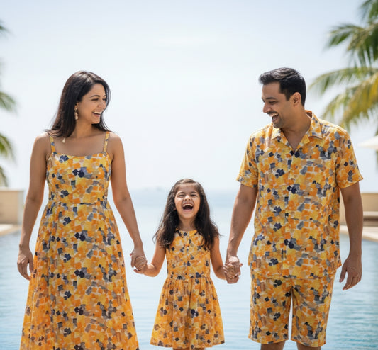Family Matching Co Ord Set –Pool Party Combo Mustard– Printed
