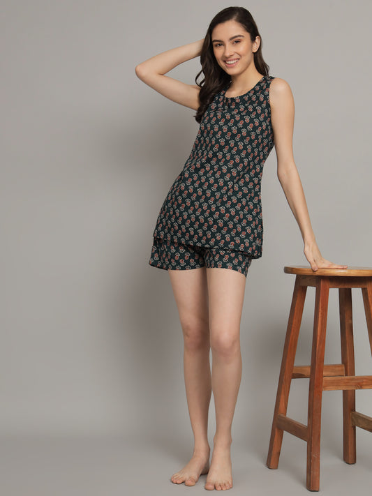 Dark Green Booti Printed Cotton Sleeveless Top with Shorts(68% OFF)Regular price ₹ 790Sale price ₹ 790 Regular priceUnit price / per₹ 2,490Sale