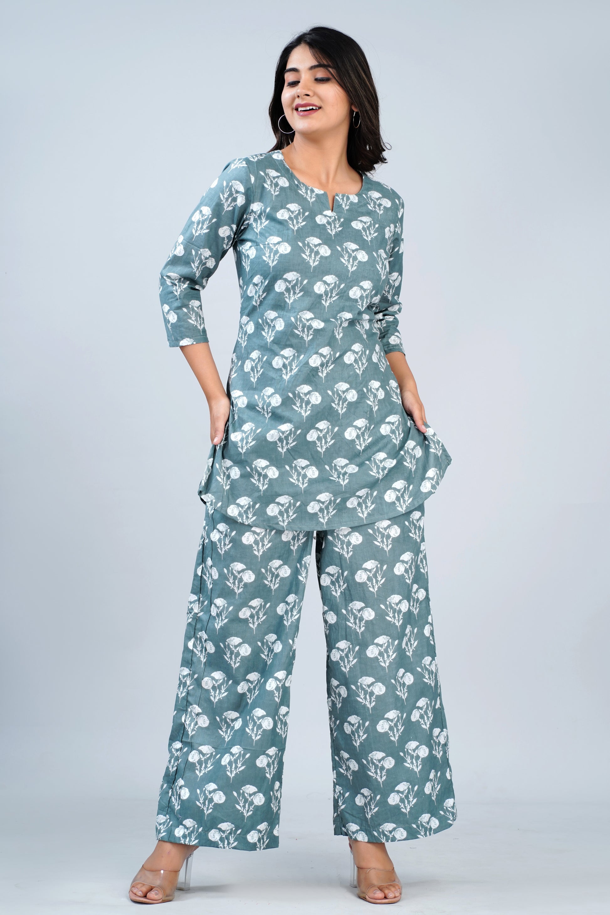 Dusty Green Booti Printed Cotton Co-Ord Set with Pallazo