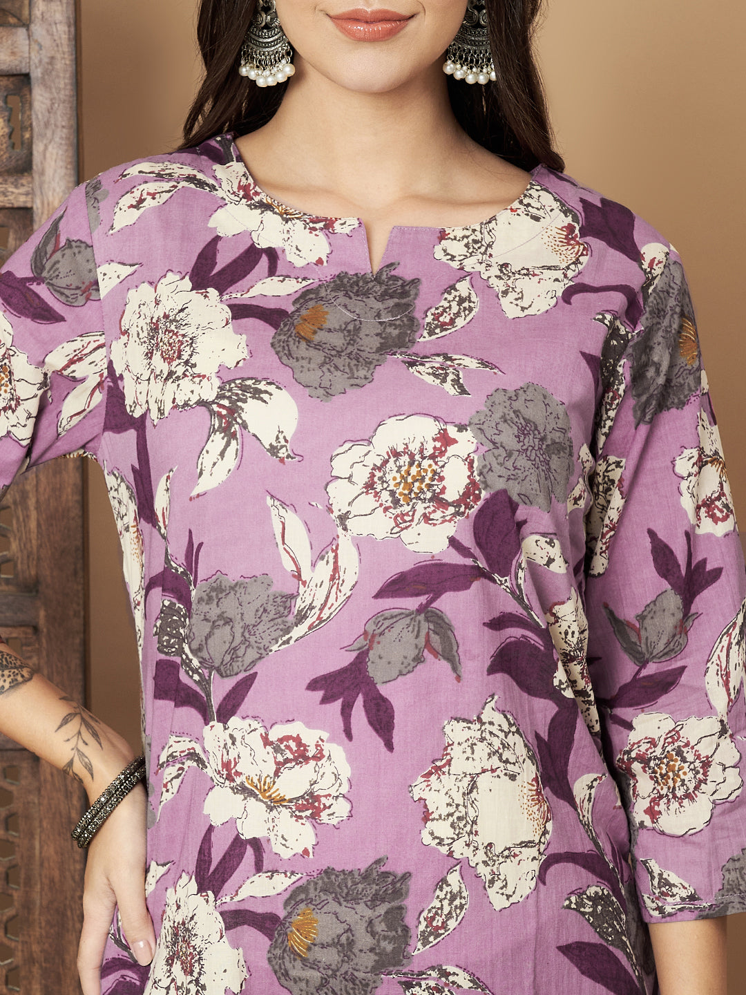 Purple Flower Printed Cotton Co-Ord Set with Pallazo